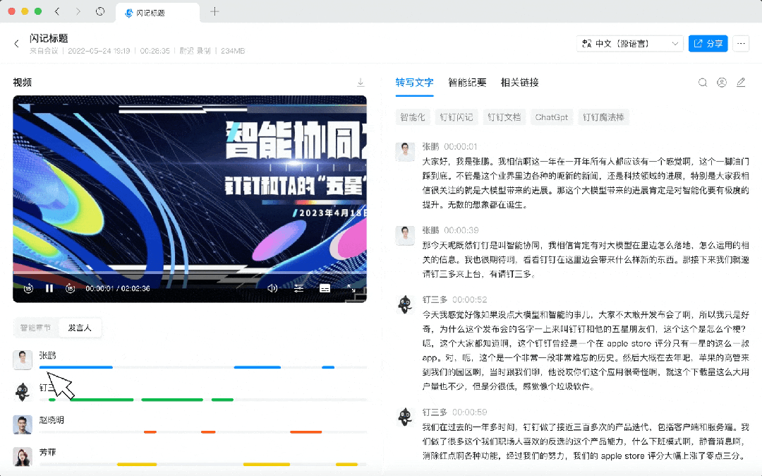 钉钉闪记在对会议音视频进行文字转写和智能摘要的基础上,更新了智能章节能力,将会议录制视频自动划分为多个易于浏览的章节,还可区分不同的发言人,并快速定位到目标内容。