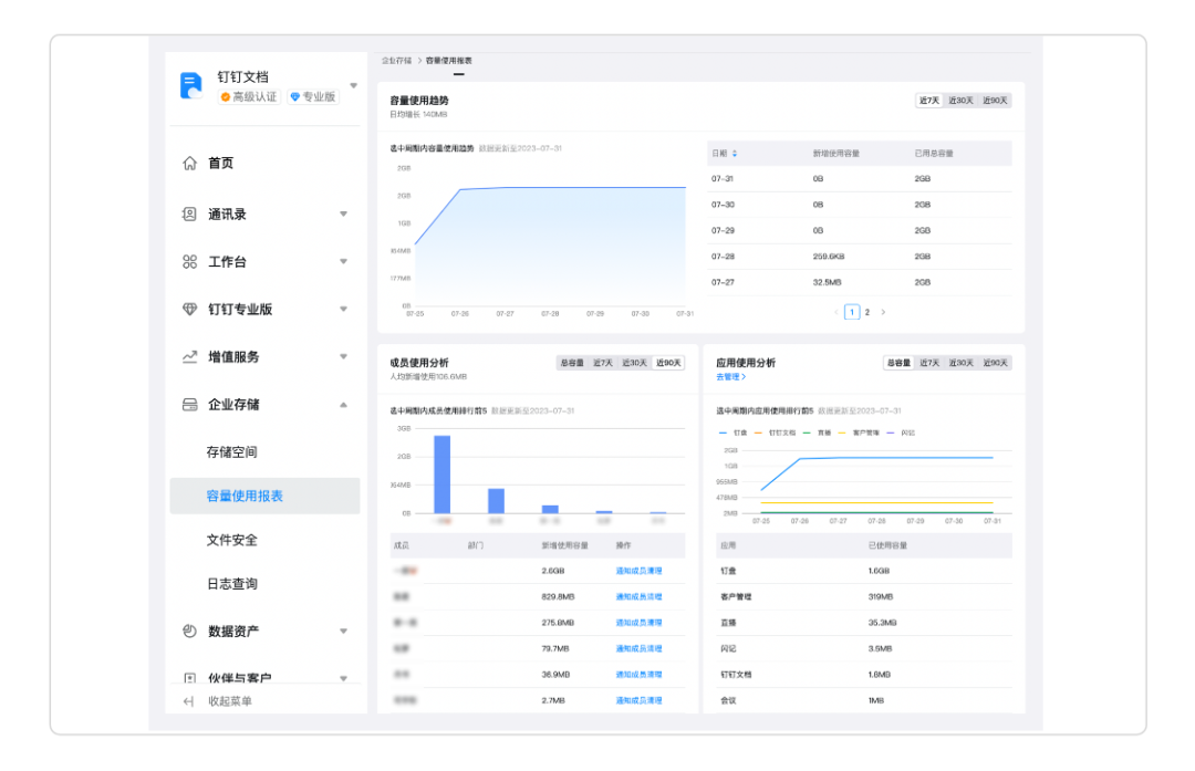 支持看到企业存储容量「容量使用报表」,管理员可在管理后台查看变化趋势和分人分应用的使用情况,方便做好钉盘容量的管理与调整。