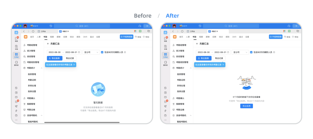 导出考勤6个月前的数据时,数据预览区域新增「导出报表」按钮,更容易找到导出入口。