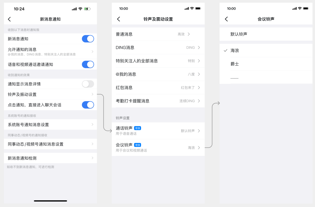 会议和通话均支持自定义铃声,从「设置-新消息通知-铃声及振动设置」进入,可选择10首预置铃声;钉钉专属版管理员可在OA后台再上传10首自定义铃声。