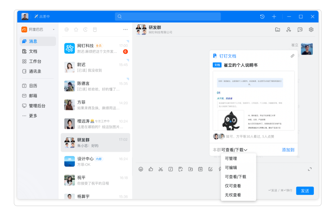 钉钉文档卡片权限体验升级,支持透出「可管理」权限并隐藏无法修改的高级权限,同时在无法修改对方权限时给出提示,让权限管理更高效,展示更清晰。