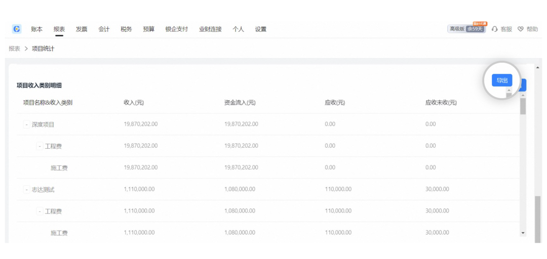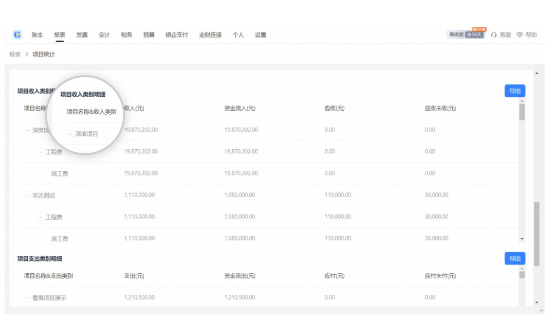 财务报表数据支持导出,可对企业收支明细进行自定义、多维度的分析,项目统计更方便。