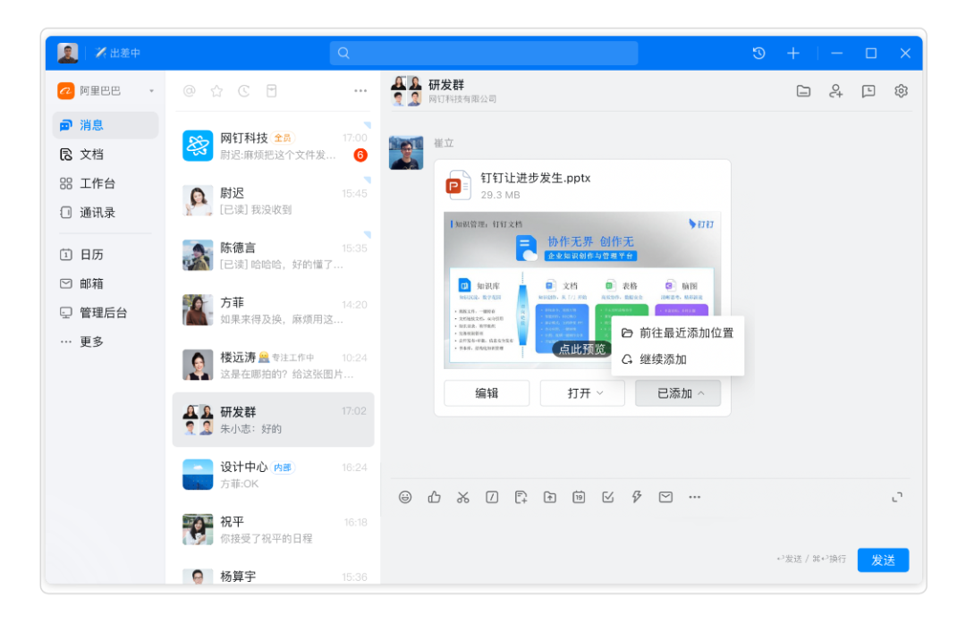 聊天文件卡片支持多次添加副本到钉盘或者钉钉文档的不同位置,让整理文件更便捷高效。