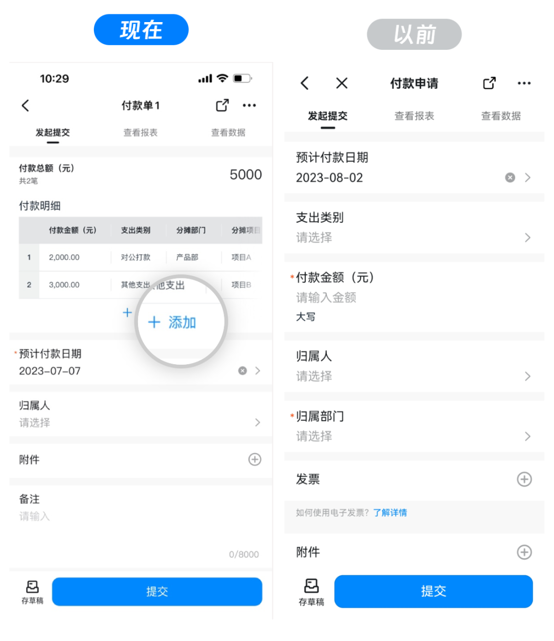 智能财务付款单、报销单支持一次审批中添加多个明细,可实现对不同项目、部门、收支类别费用的分摊。