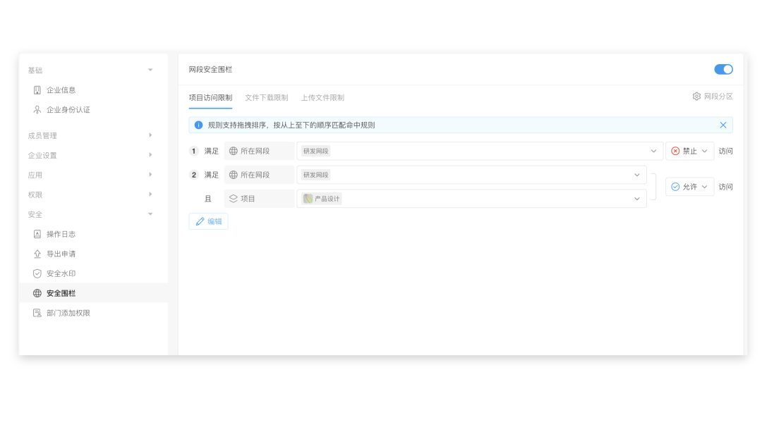 支持自定义多种条件限制项目访问、文件下载及上传,保证机密信息不泄露,轻松平衡高效协作与企业信息安全。