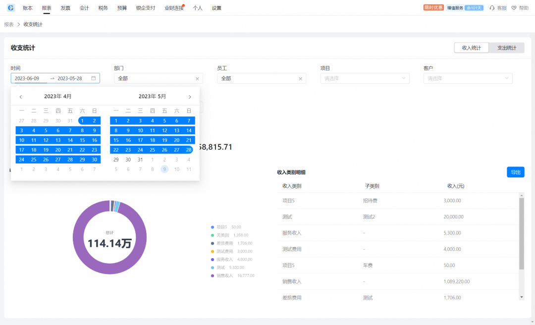 财务报表支持以天为单位查看「收支统计」,便于灵活分析企业的经营情况。