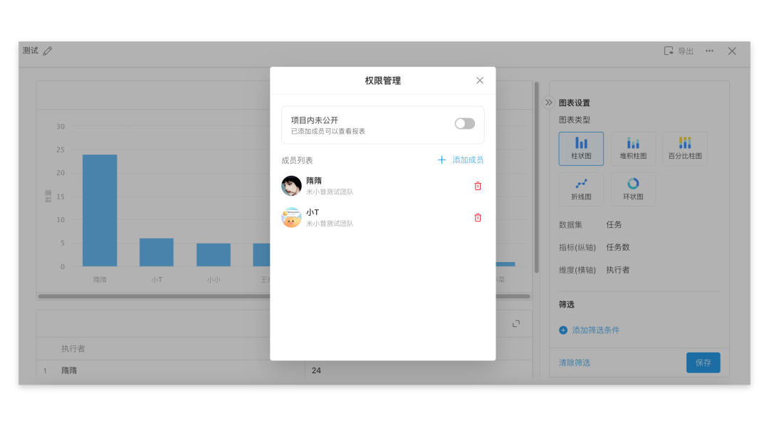 点击「项目统计」,选择「我创建的报表」或「分享给我的报表」,即可设置成员查看权限,满足更多数据权限的管理场景。