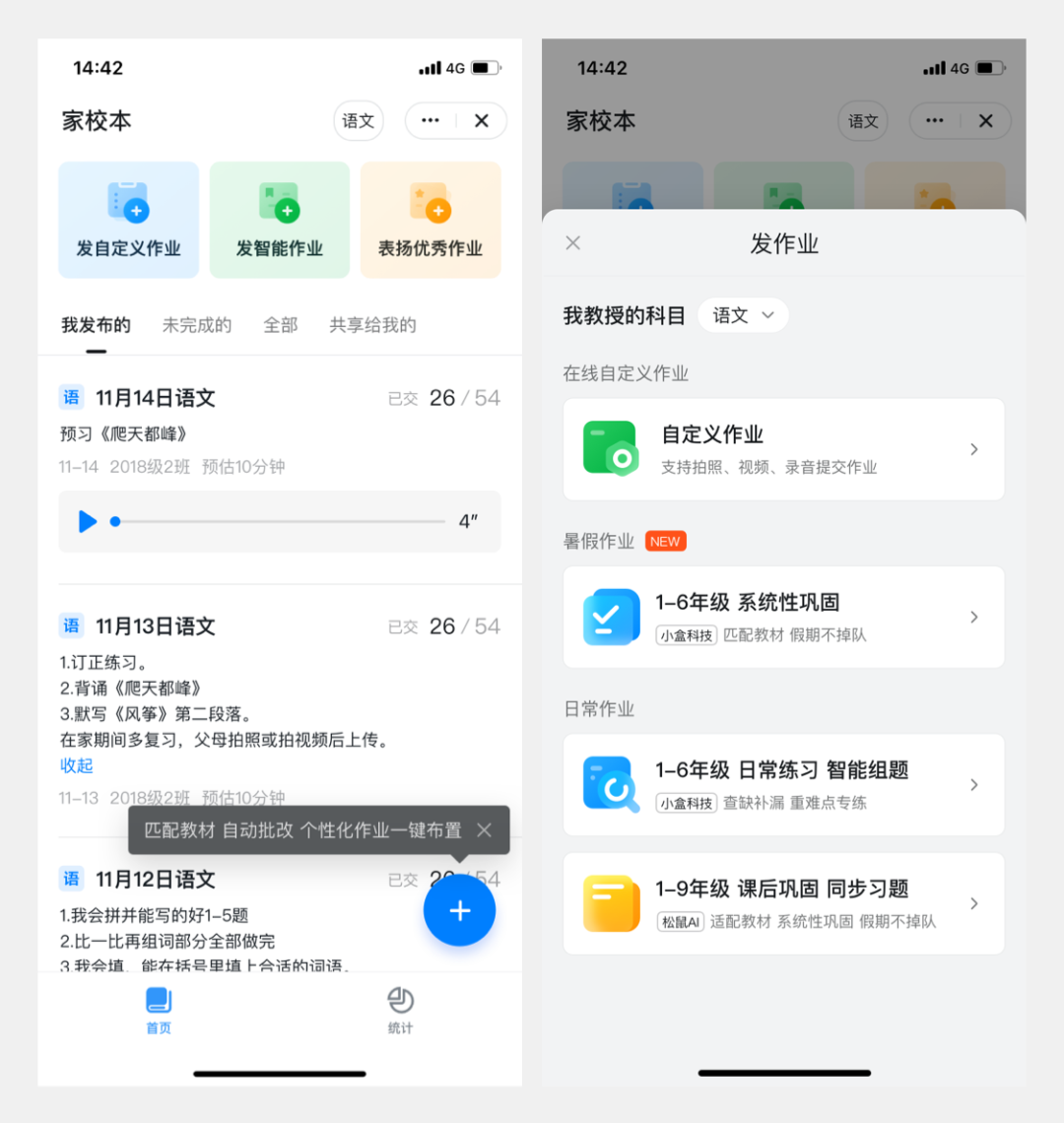 老师端新增「+」号快捷发布入口,智能作业按照功能维度归类分组,更清晰明确。