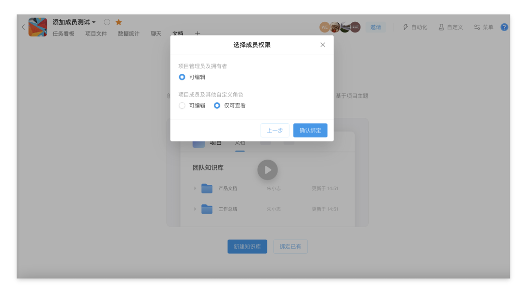 支持在项目绑定知识库的过程中,赋予成员不同权限,更灵活地保障知识库的信息安全。