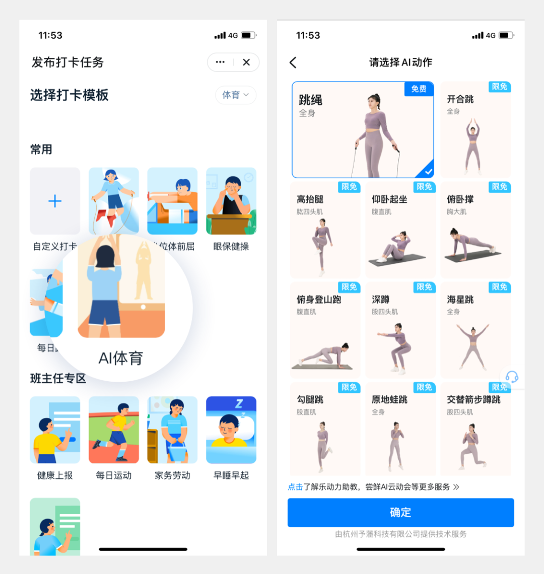 新增AI体育打卡能力,支持11种动作,基于人体骨骼画像自动计数并生成过程性高光时刻。