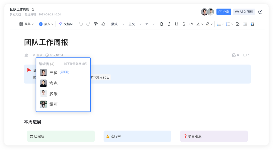 支持按照文档贡献度排序显示编辑者,能够快速查找并定位文档的主要编辑者,让团队沟通协作更高效。