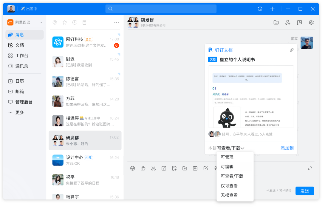还在对文档卡片上“可管理”权限被降级处理为“可编辑”权限而感到疑惑吗?钉盘、钉钉文档权限水位对齐啦,祝你摆脱降权小困惑,支持透出「可管理」权限并隐藏无法修改的高级权限,同时在无法修改对方权限时给出提示,让权限管理更高效,展示更清晰。