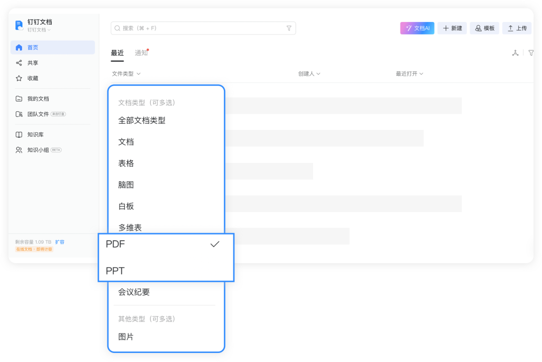 查找文件时文件类型支持按照 PDF、PPT 为条件进行快速定位,查找类型更丰富,效率翻倍。