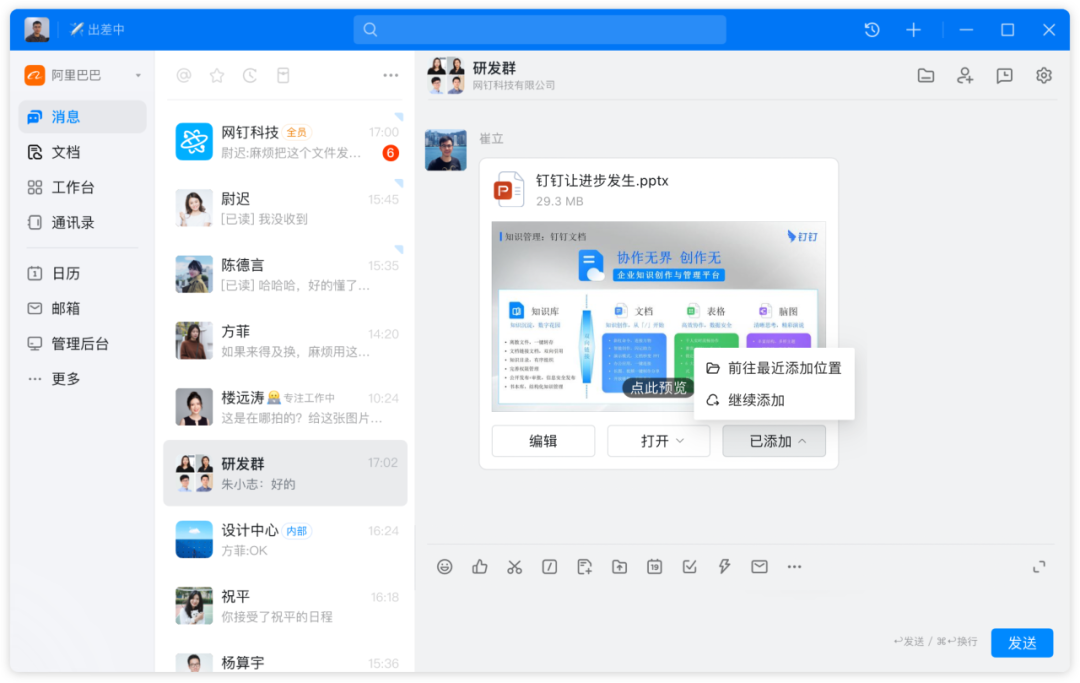 整理聊天文件时,想要将同一文件保存到不同位置?聊天文件卡片支持多次添加副本到钉盘或者钉钉文档的不同位置,让整理文件更便捷高效。