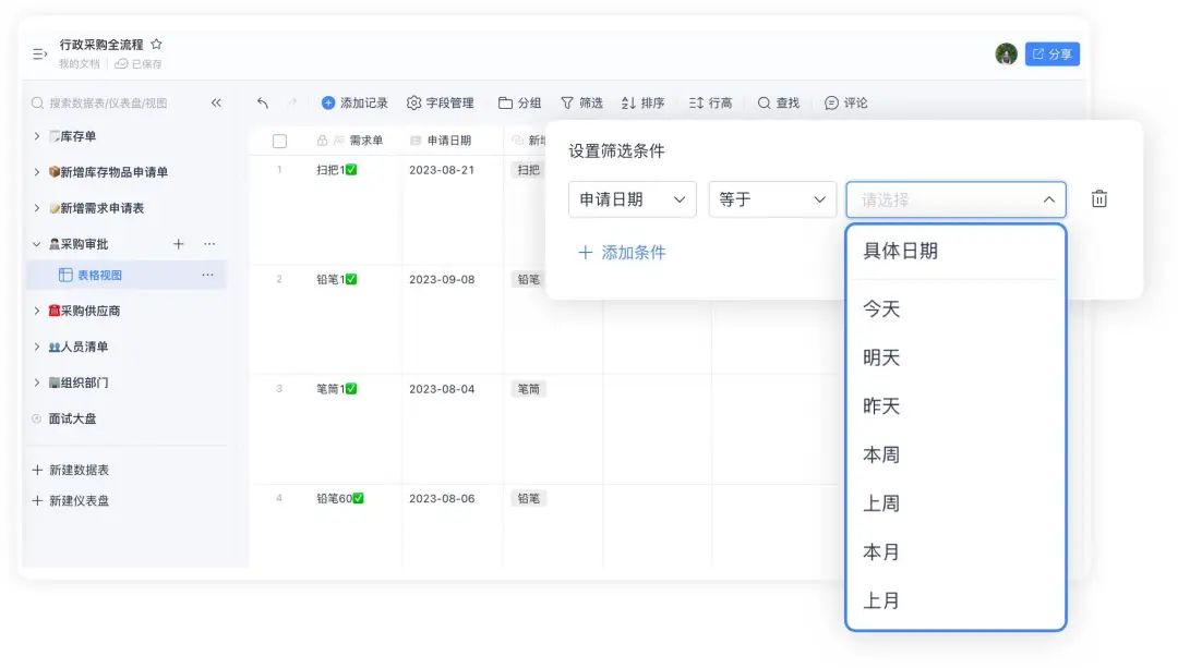 新增时间筛选条件,支持本周、本月、上周、早于、晚于等时间周期筛选条件,帮你快速筛选数据。