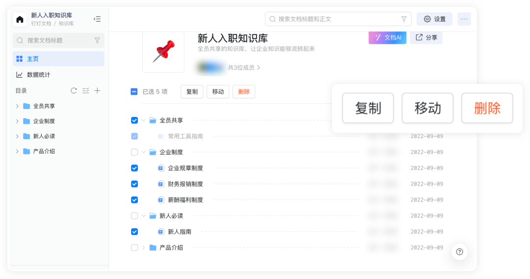 知识库支持管理员进行批量移动、复制、删除文件等操作,免去来来回回重复操作的烦恼,快速做好文件整理,让知识管理更快捷、更高效。