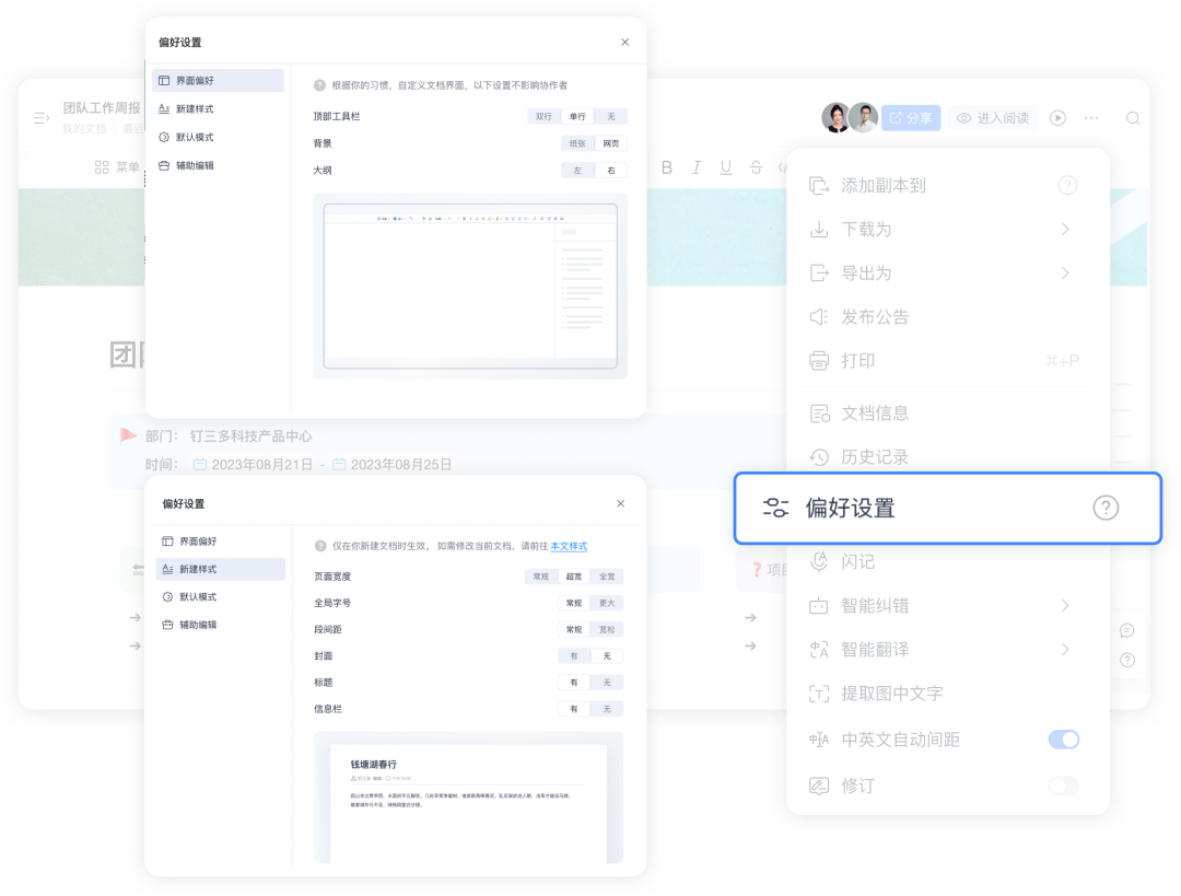 文档支持根据喜好对界面进行个性化偏好设置,包括界面偏好、新建样式、默认模式和辅助编辑,满足个性化使用要求。