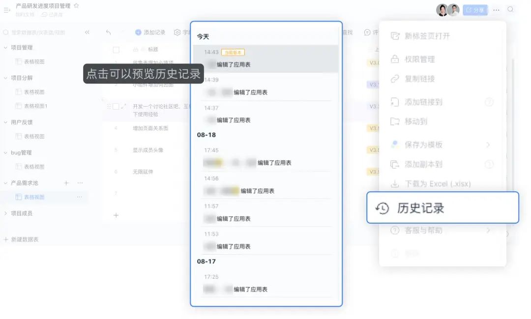 支持查看全文历史记录,可查看团队成员操作记录,让删改有迹可循,变更有据可依。
