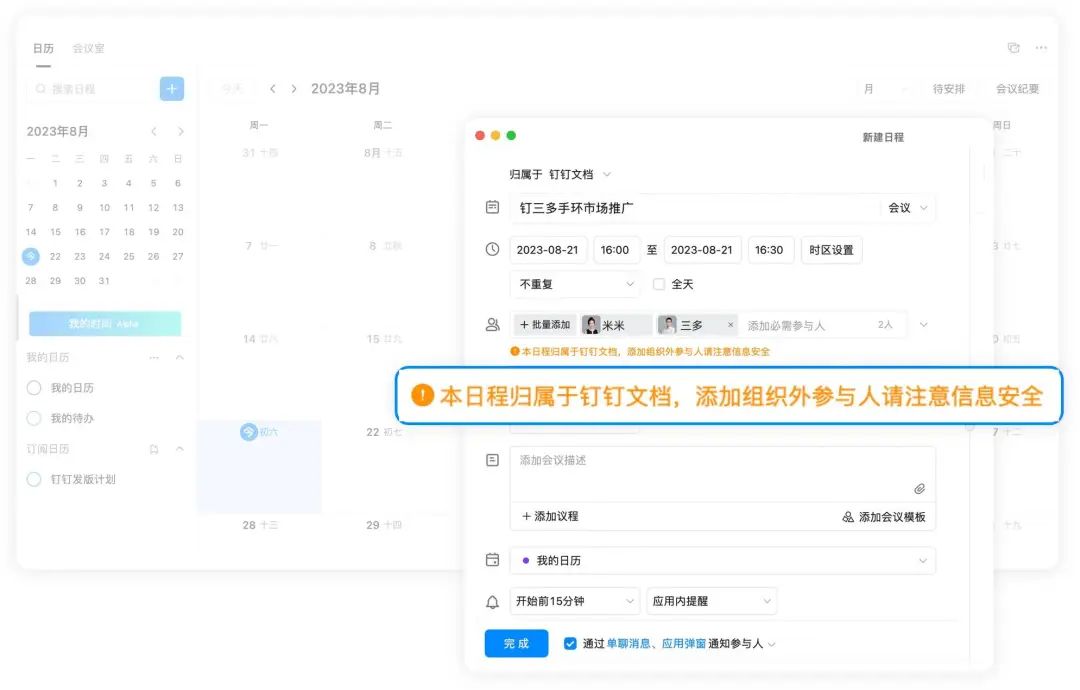 2、归属于组织的日程,支持添加外部参与人,日程中标记为外部参与人,并做相应的安全提醒;