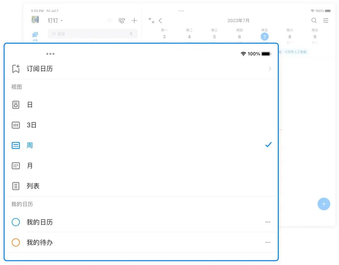 在 iPad 端或 Android 设备(分辨率宽度大于等于1080)下支持周视图,可清晰查看一周日程信息,高效合理安排本周工作。