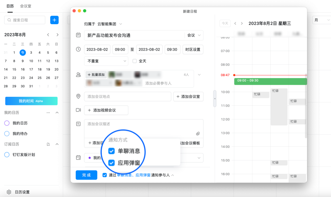 创建日程时,支持选择「单聊消息」和「应用弹窗」两种通知方式,让日程信息更精准触达参与人,不错过关键会议。