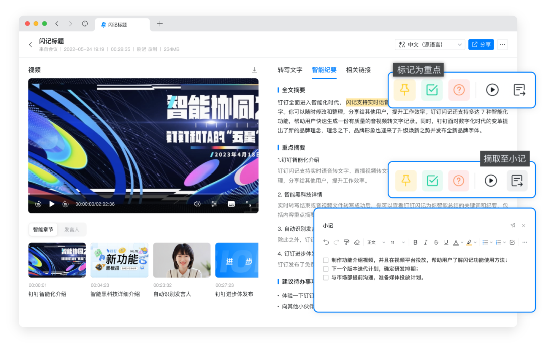 支持对会议转写内容中的重点事项、问题和待办进行标注,并可一键导入「小记」进行分享等操作,突出会议重点,让会议回顾更高效。