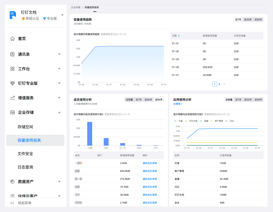 想要了解企业存储容量情况?管理员可在管理后台「容量使用报表」中,查看变化趋势和分人分应用的使用情况,方便做好钉盘容量的管理与调整。