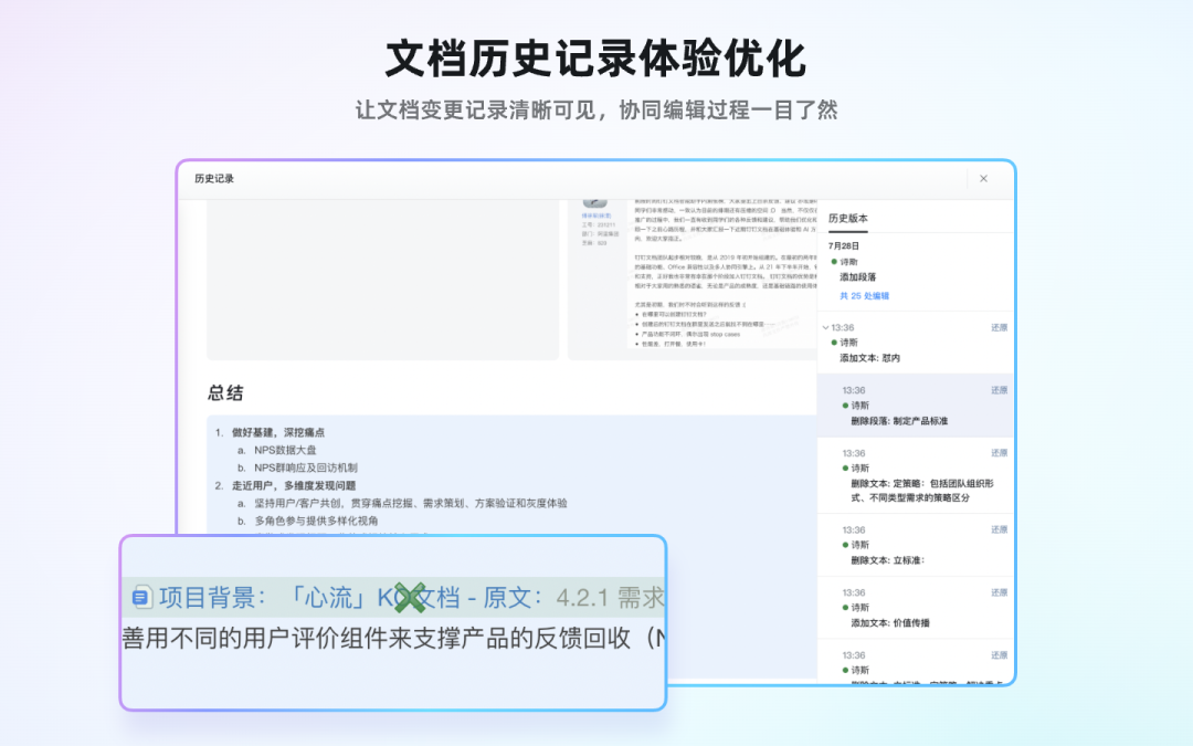 查看历史记录的体验优化,可清晰区分「添加、修改、删除」操作行为,点击编辑历史可直接定位和高亮标识修改的区域,让文档变更记录清晰可见,协同编辑过程一目了然。