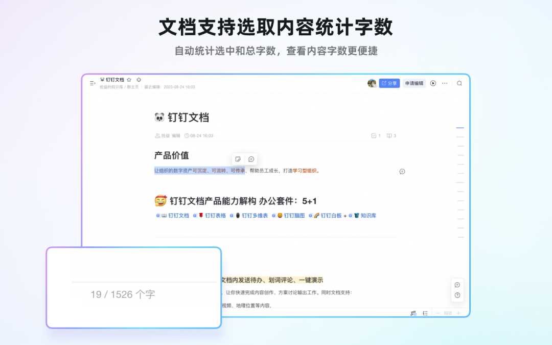 查看或编辑状态,均可以划词选中部分内容,文档会自动统计选中内容的总字数,查看内容字数更便捷。