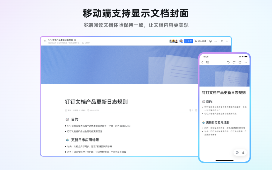 手机使用文档支持显示文档封面,多端阅读文档体验保持一致,让文档内容更美观。