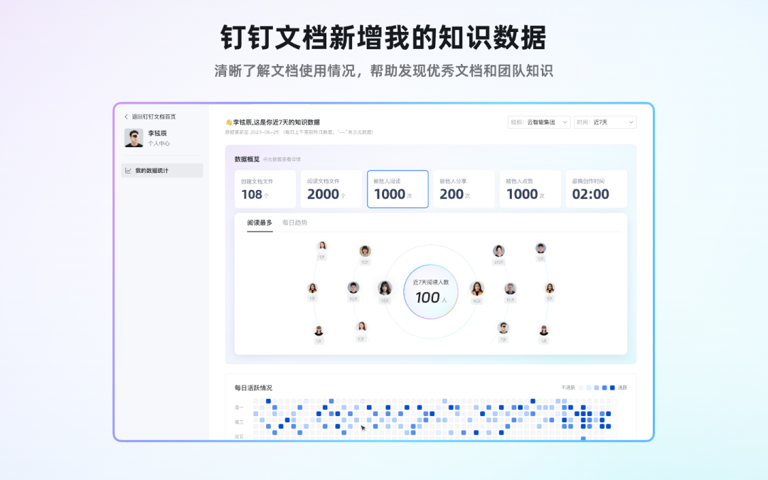 新增「我的知识数据」,可查看个人使用文档的情况,支持按时间周期统计分析个人文档的创建、查看、协作情况,还有文档推荐功能,帮助发现优秀文档和团队知识。