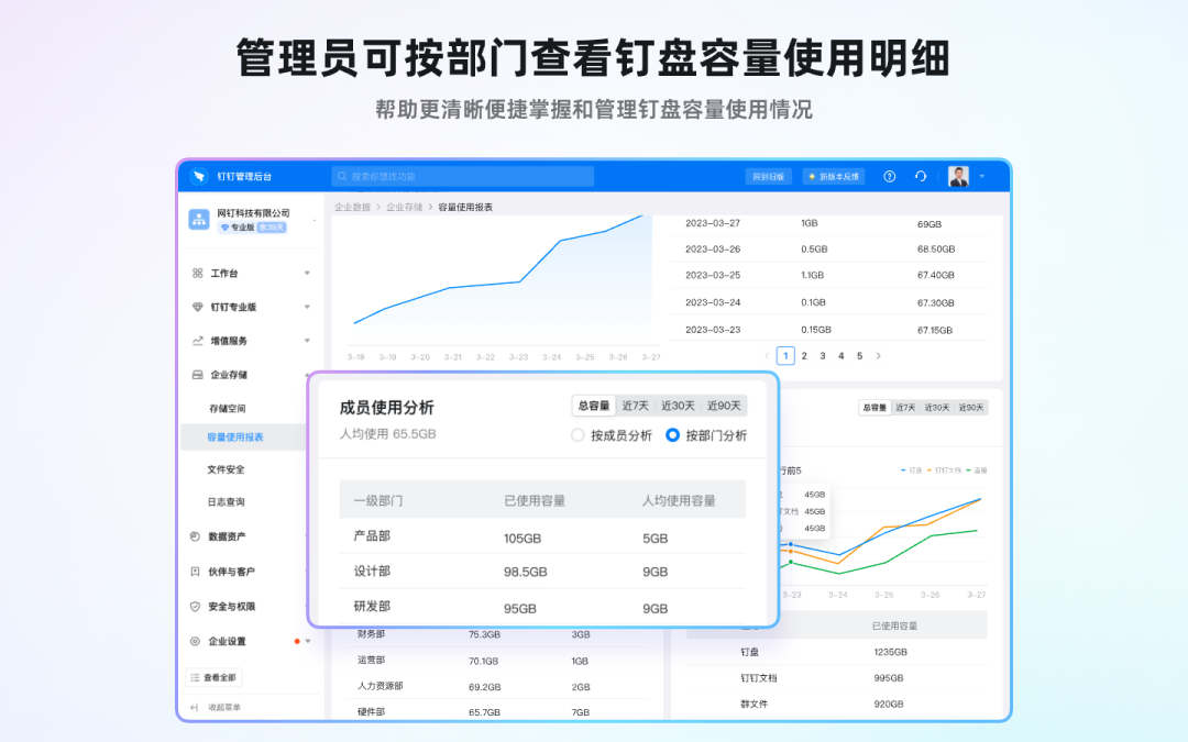 专业版组织管理员可以按部门查看存储容量数据、也可按人员维度查看应用使用数据,精准掌握钉盘容量使用情况,帮助管理员更便捷地进行容量管理。