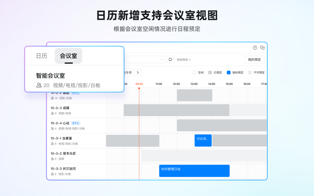 新增会议室视图,可根据会议室空闲情况进行日程预定,快速、精准地匹配会议室。