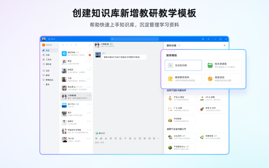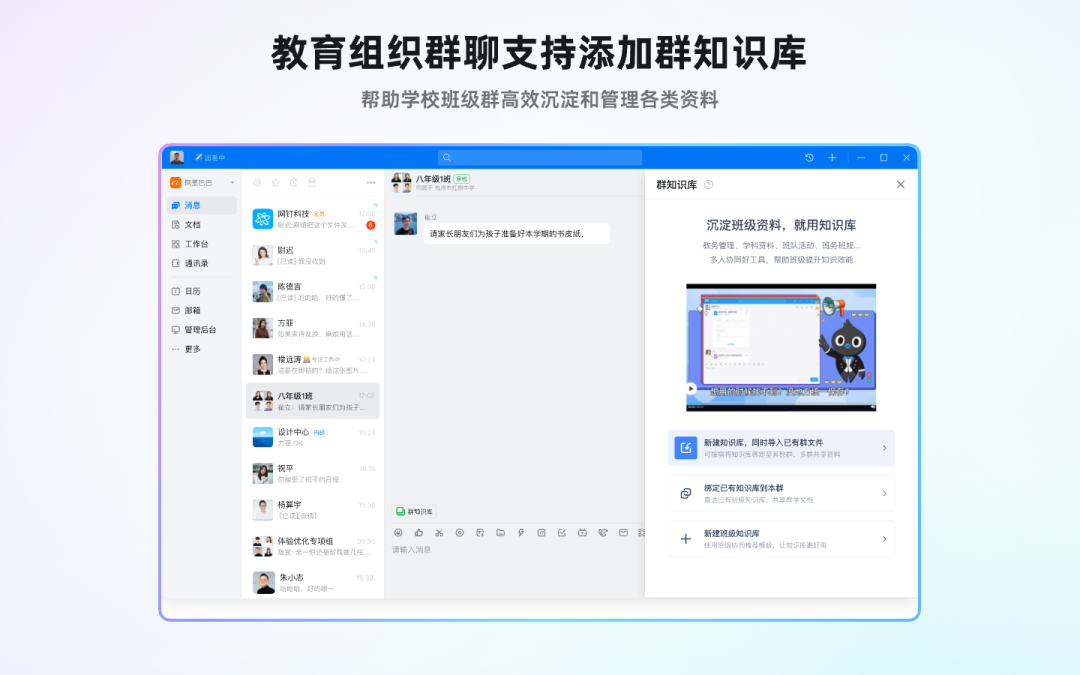 家校群支持使用群知识库,支持将知识库绑定到多个群聊,帮助学校高效沉淀、管理、分享各类资料,提升知识管理效率。