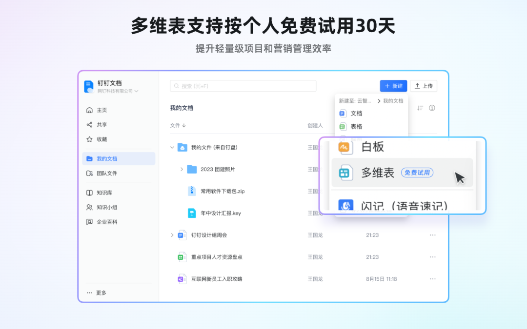 标准版现已支持组织用户按个人维度免费试用多维表 30 天,帮助做好轻量级项目和营销管理。