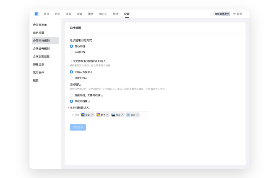 支持设置合同归档规则