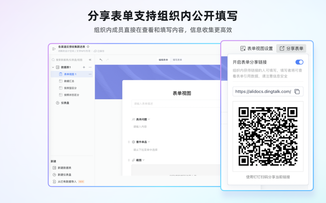 开启表单分享后,支持组织内成员直接查看和公开填写内容,信息收集更高效便捷。