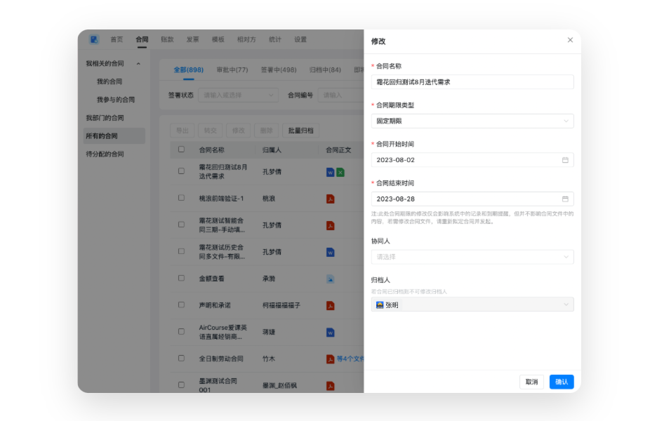 支持对合同结束时间、签署方式等合同关键信息进行二次修改。