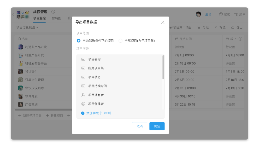 项目集支持导出项目数据,项目集管理员或拥有者可以进入「项目集 - 导出」设置自定义字段导出,可以更好地管理和留存项目集相关数据。