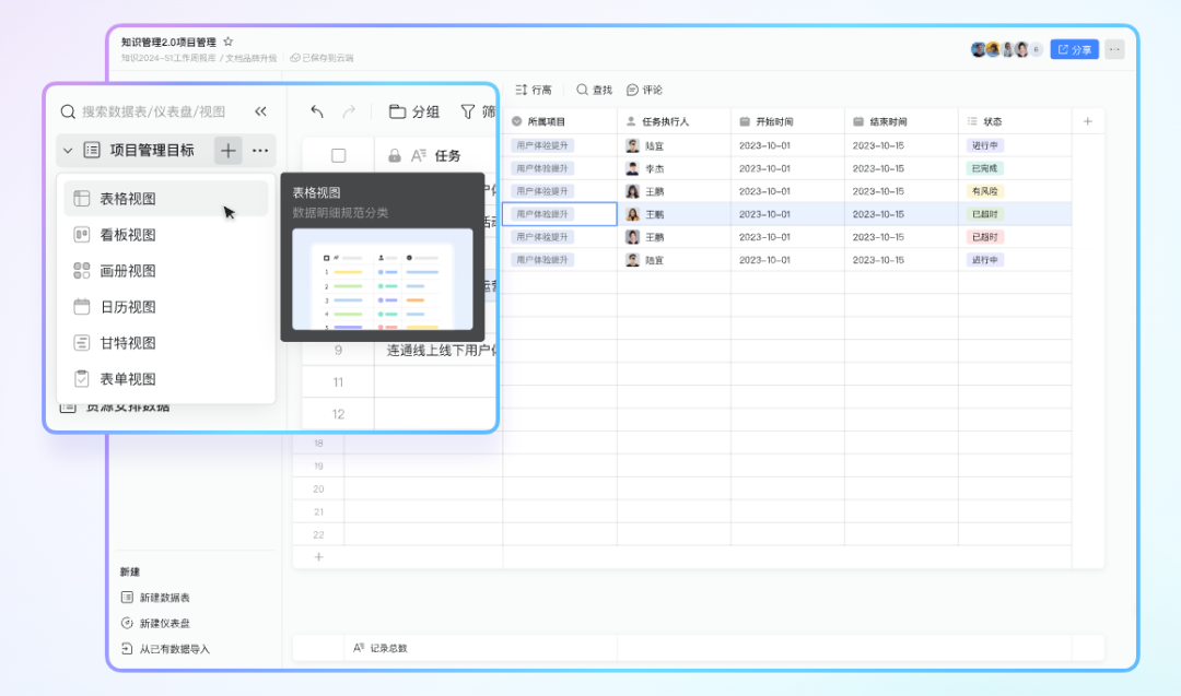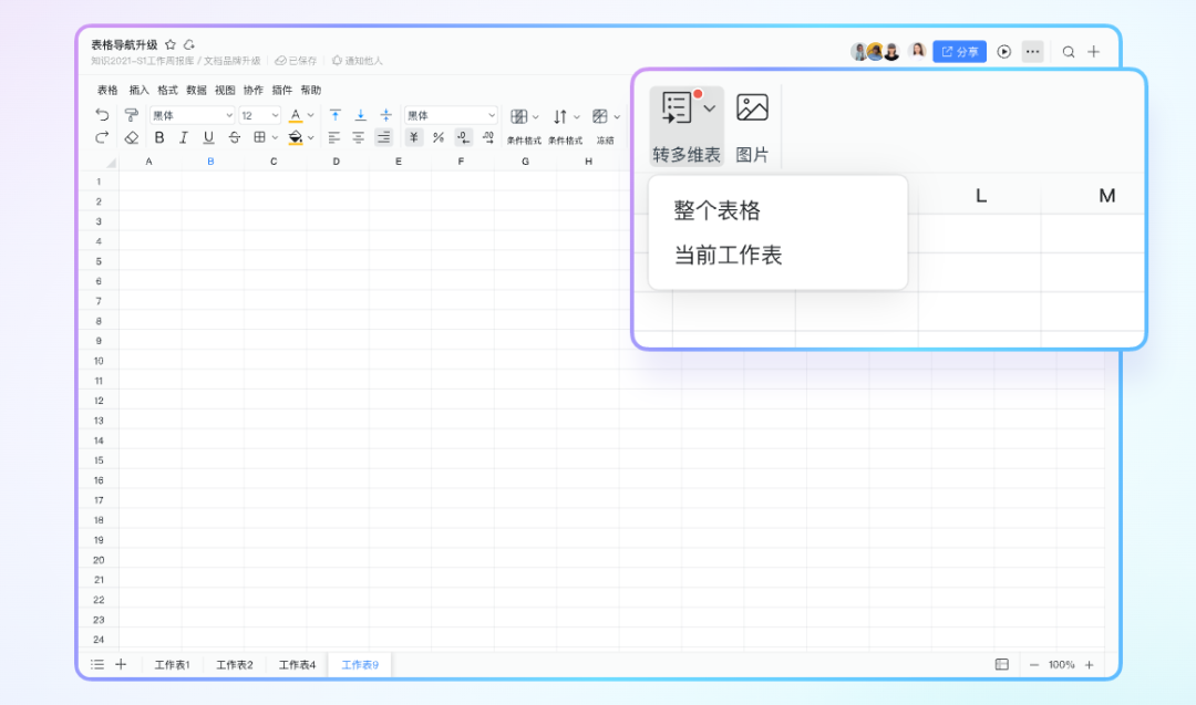 在线表格支持直接转换为多维表,畅享更灵活的视图展示,更清晰的数据排布,更简单高效的数据分析。