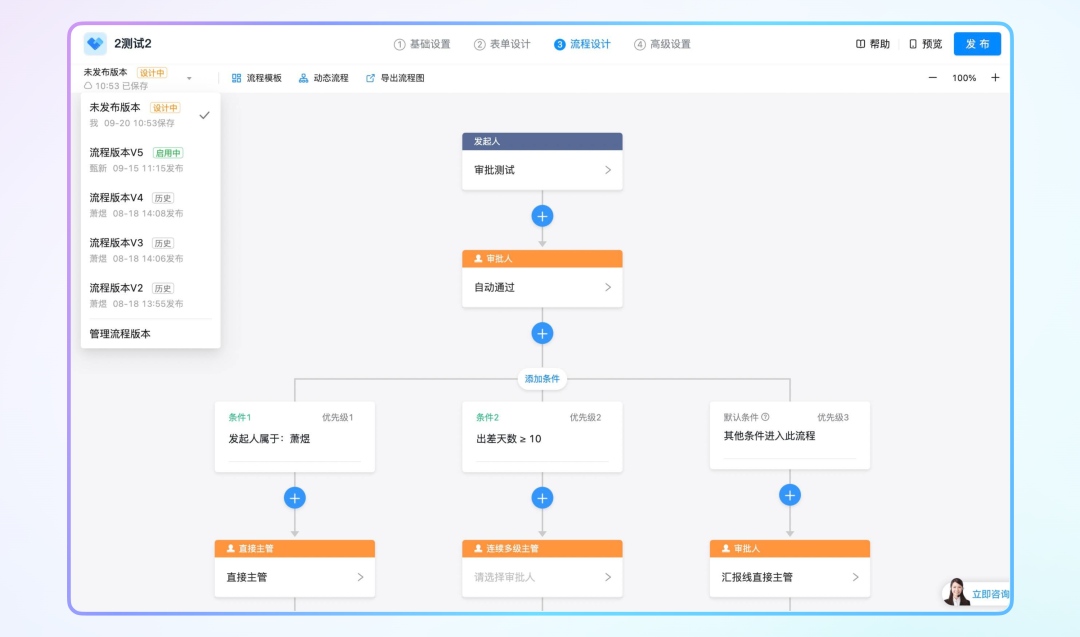 在「流程设计」中,支持管理新老版本,并可将复杂流程保存为模板方便后续一键复用,支持一键导出各个版本流程图,满足流程审计诉求,让组织流程管理无死角。
