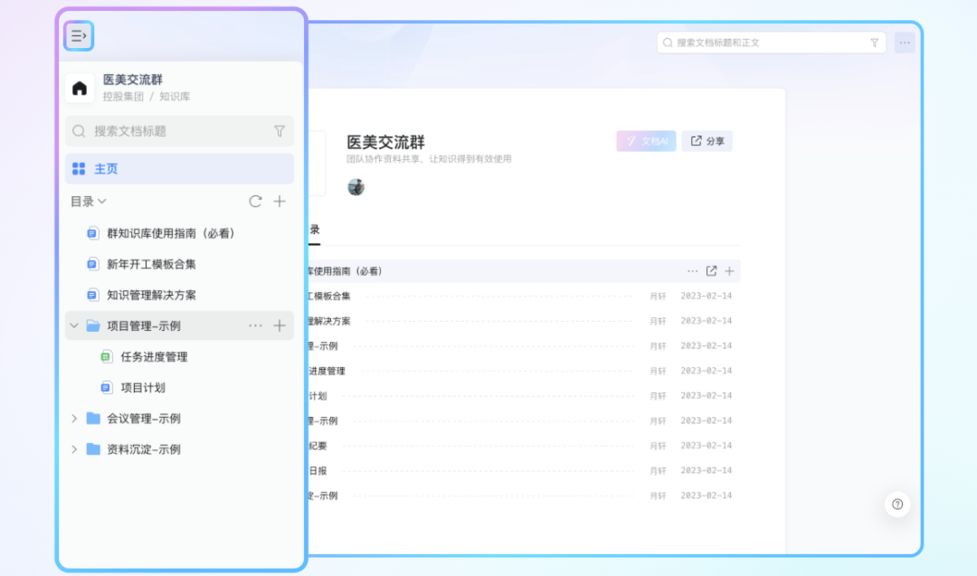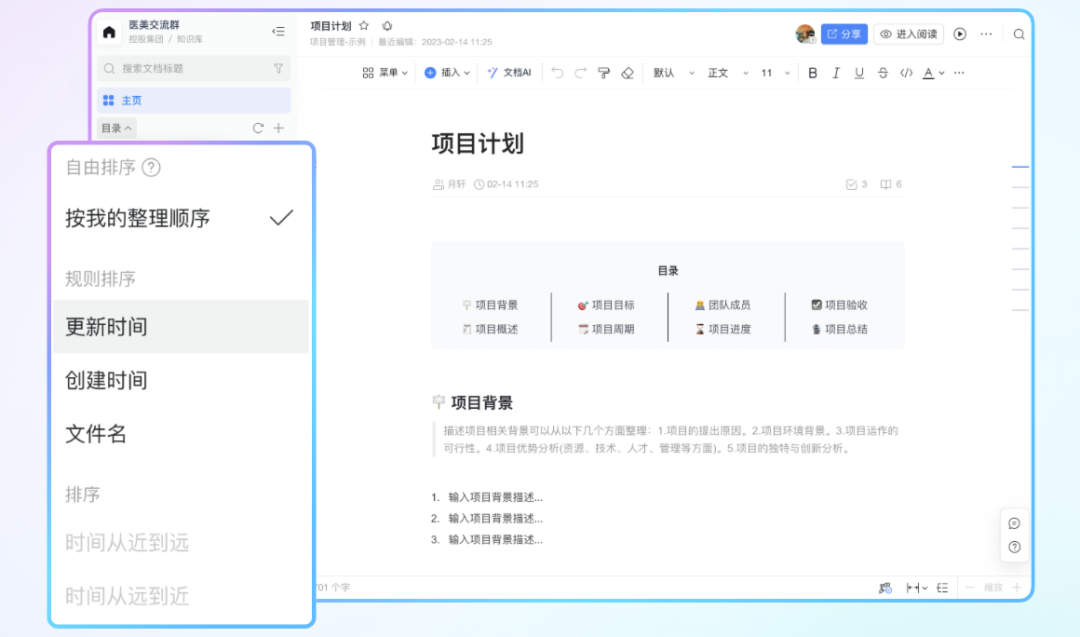 「我的文档/知识库」支持按名称、创建时间、更新时间等多种顺序排序,高效管理和查找资料,让文档管理更加井然有序。