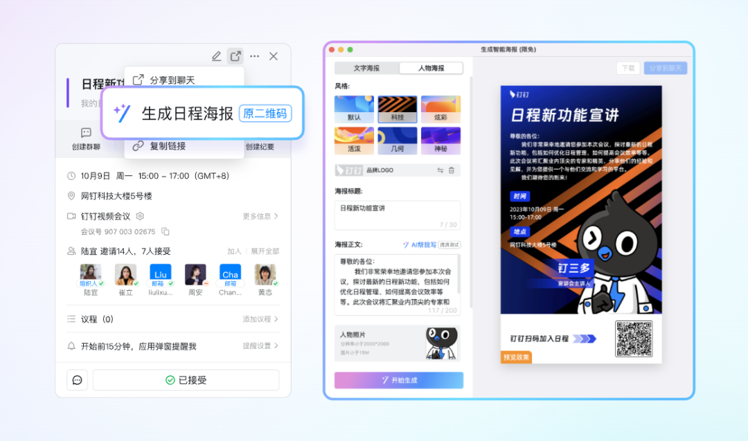 钉钉日历可快速生成「文字海报」或「人物海报」两种形式,可根据日程信息自动生成文案内容,上传人物照片可自动完成人物抠像,海报制作更加方便快捷。