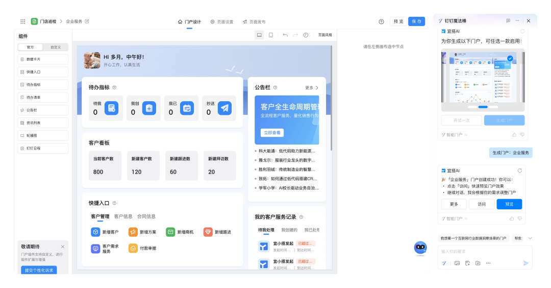 在门户设计中,AI 可帮助你快速匹配业务场景,生成不同主题风格且支持播报的门户首页;还可以与 AI 对话微调门户,节省开发时间,提升使用体验。