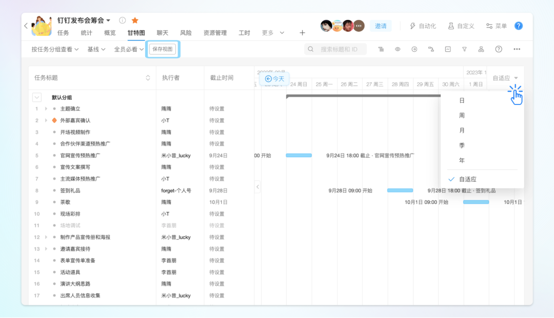 当切换时间刻度时,甘特图会提示保存该视图,帮助成员更好地管理或查看项目信息。