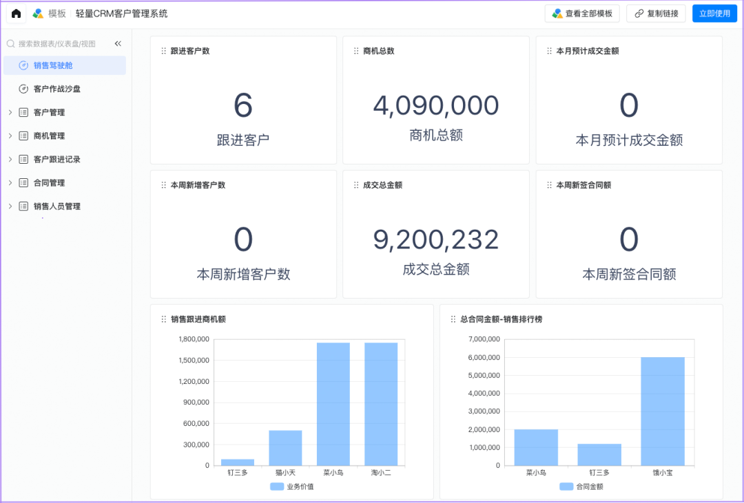 超好用的 轻量CRM客户管理系统,你可以随时随地收集和整理客户的联系方式、需求和偏好。提供销售驾驶舱、客户管理、商机管理、客户跟进,一站式帮你及时跟进客户需求,提高客户的忠诚度和满意度!