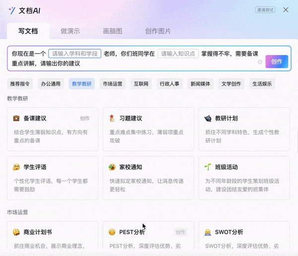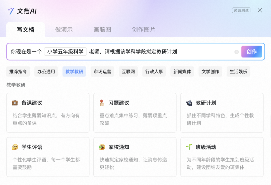 超好用的工具来啦!现在可以在钉钉上利用神奇的文档 AI 来提高备课效率了,生成教学大纲、编辑备课文档、制作教学ppt、生成班级活动方案等一些列超级实用工具来袭。