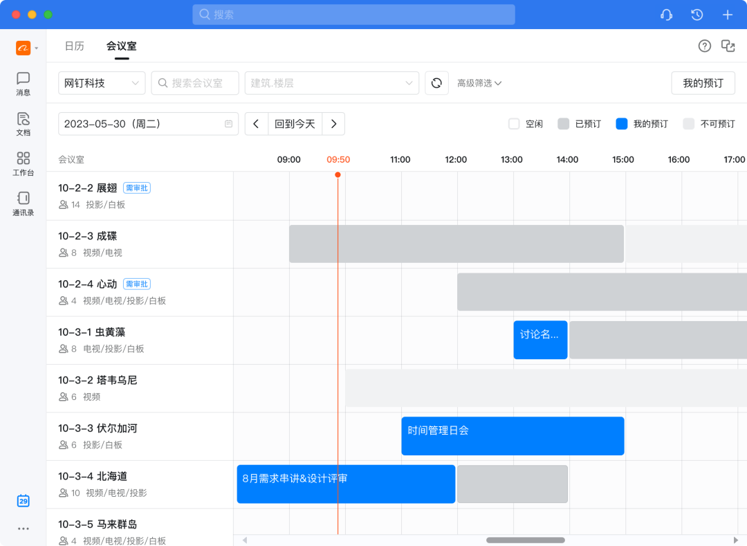 在日历首页增加会议室入口,展示会议室列表和忙闲状态,用户可通过时间轴筛选出需要的会议时间,快速创建日程入会,预定体验更加顺滑。