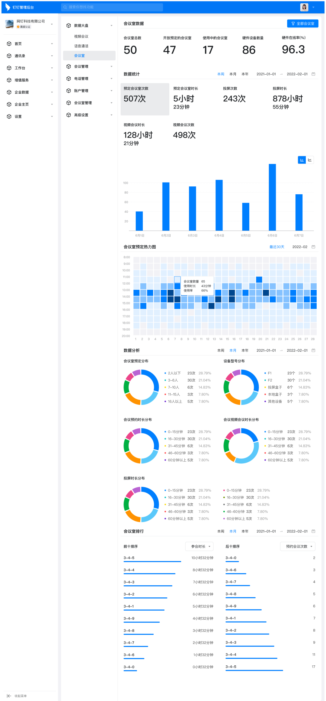 通过会议室排行,快速定位异常会议室,进行会议室改造和优化。