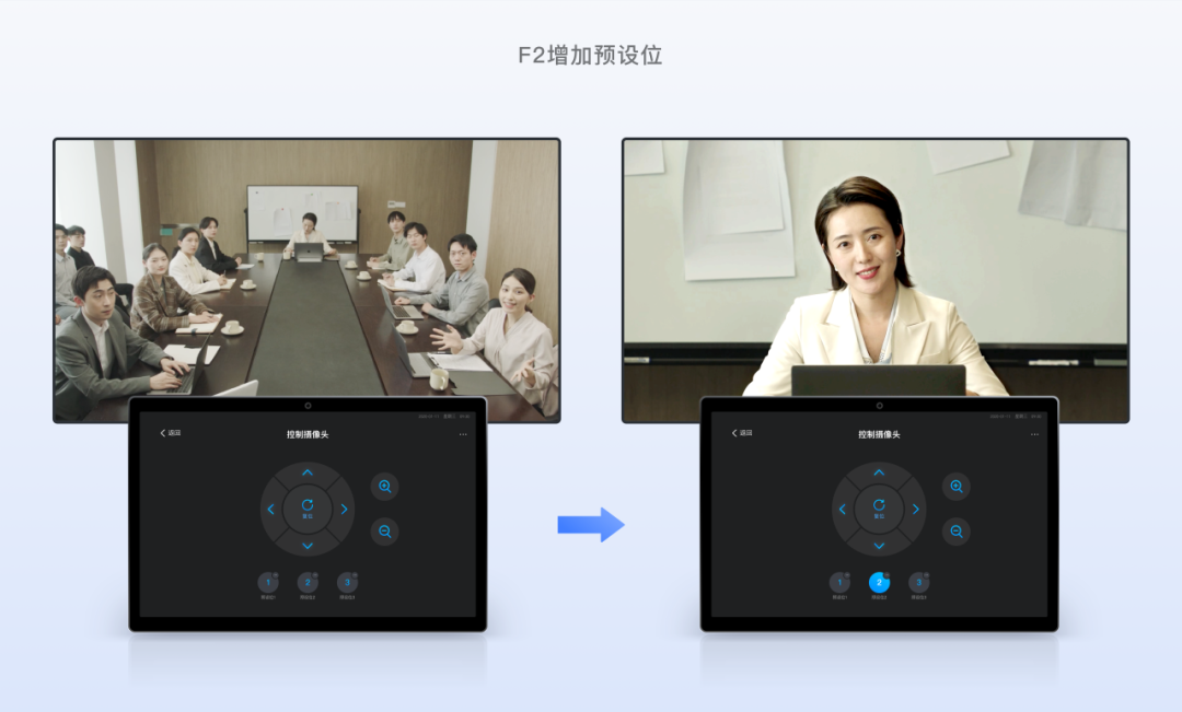 手动导播功能支持设置三个预设位,可以在会议开始前手动设置进行画面定位,在会议中进行快速切换,满足全景、特写、特定镜头的切换展示。